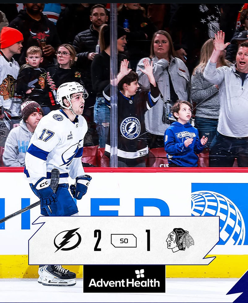 The Lightning were able to get past Arvid Soderblom in the 2nd period of this game. Nikita Kucherov would net his 25th goal of the season with assists from Brandon Hagel and Anthony Cirelli. It was a perfect pass from Brandon Hagel in front of the net. Kucherov now extends his point streak to 4 games . Brandon Hagel now has 16 points over his last 11 games for the Lightning. The Lightning and Blackhawks entered the 3rd period 1-1.